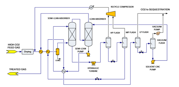 For fluor solvent offshore process, Pulverized Coal (PC) is used as the solvent because PC unit can operate with the low solvent circulation, recovering more hydrocarbon and is lower cost option when used to process high-CO2 gases. Refrigerant can be generated through theletdown of rich solvent using hydraulic turbine, eliminating external refrigeration requirement.