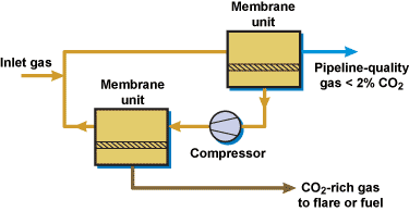 In a typical CO2 removal membrane system, the feed gas is first filtered to remove anyentrained liquids and aerosols. The gas then enters the membrane filters. The CO2 as well as the H2S and H2O permeate preferably through the membrane. The non-permeated gas, mainly CH4, remains at pressure and is the product gas.This technology combines high permeability with high hydrocarbon resistance, making it an attractive option for bulk carbon dioxide removal. In addition, the operation is highly flexible, it requires little maintenance, making it ideal for remote and offshore locations.